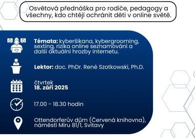 Zveme rodiče na osvětovou přednášku zaměřenou na bezpečnost dětí v online prostředí. Společně se podíváme na témata, se kterými se děti a dospívající na internetu nejčastěji setkávají – kyberšikanu, sexting a další rizika virtuální komunikace.