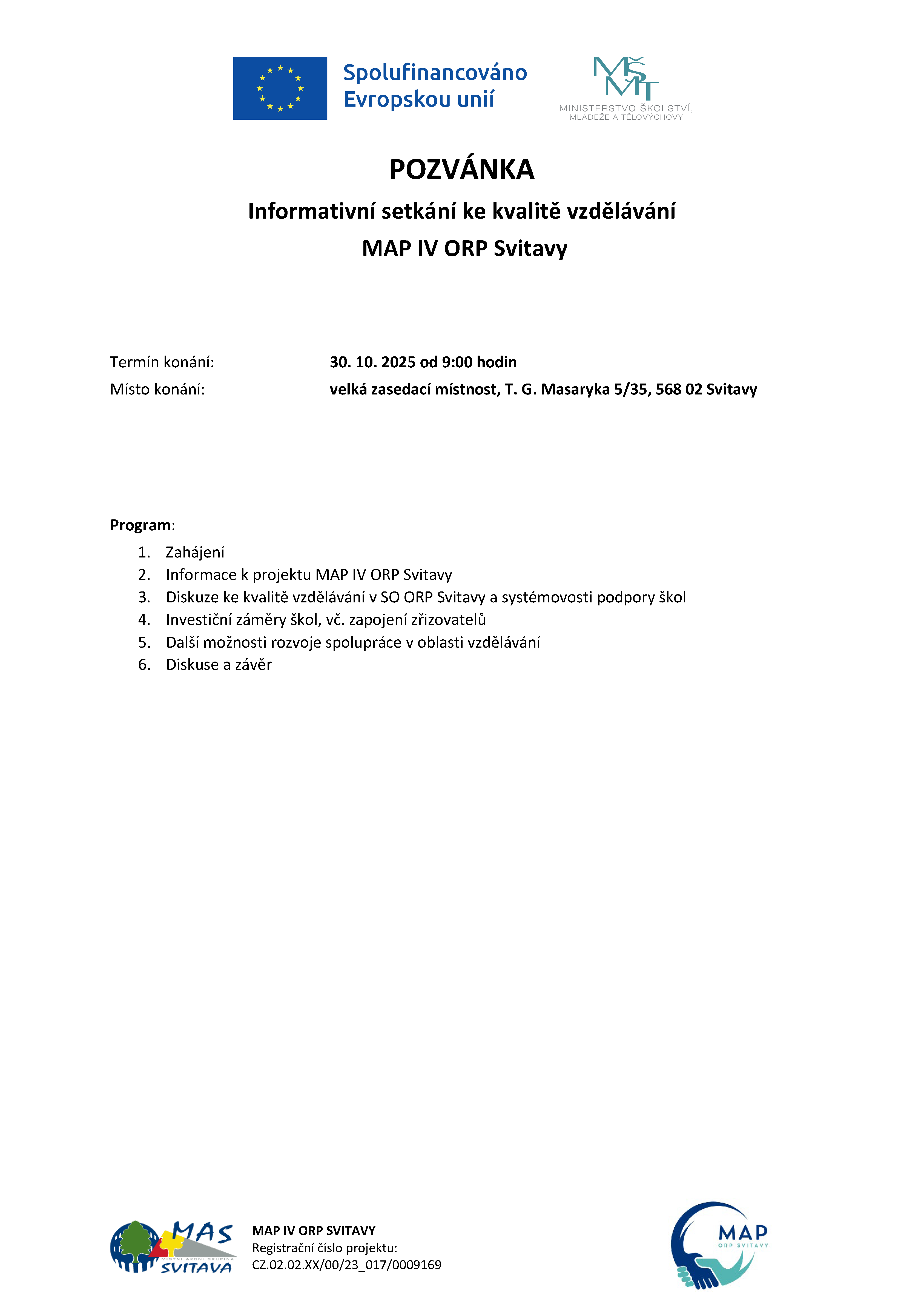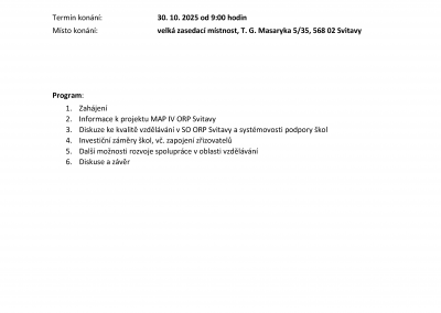 Zveme vás na informativní setkání v rámci projektu MAP IV ORP Svitavy, jehož cílem je otevřená a přínosná diskuze nad kvalitou vzdělávání v území a možnostmi další spolupráce.